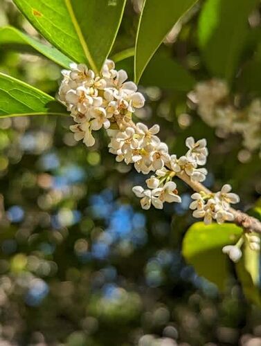 散歩道で見つけたギンモクセイ(銀木犀) 花言葉は「初恋」 青空に白い花が映えます。 金木犀も銀木犀のそろそろ終わりです。 これからは紅葉の季節になります